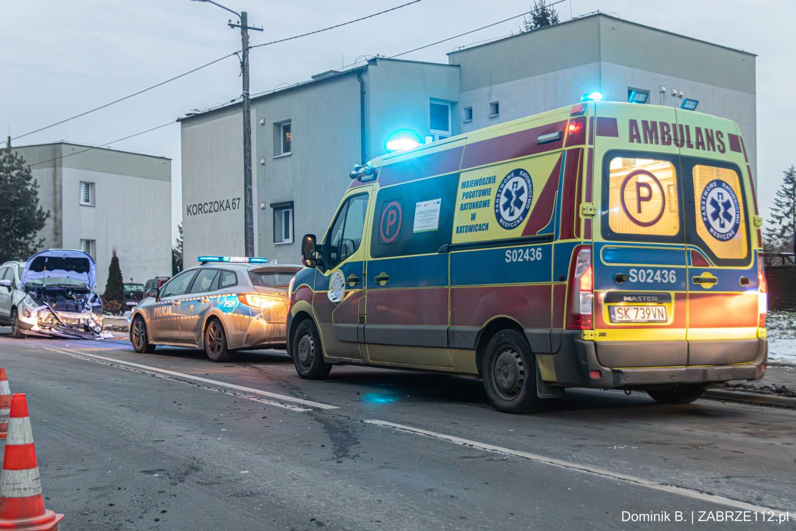 Droga na ulicy Korczoka jest całkowicie zablokowana w obu kierunkach. Policja prosi o cierpliwość i wybieranie tras alternatywnych. Na miejscu interweniują dwa zastępy z Jednostki Ratowniczo-Gaśniczej w Zabrzu, dwa patrole policji oraz Zespół Ratownictwa Medycznego.
