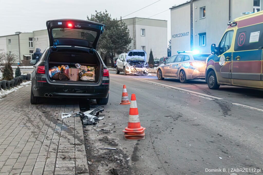 Droga na ulicy Korczoka jest całkowicie zablokowana w obu kierunkach. Policja prosi o cierpliwość i wybieranie tras alternatywnych. Na miejscu interweniują dwa zastępy z Jednostki Ratowniczo-Gaśniczej w Zabrzu, dwa patrole policji oraz Zespół Ratownictwa Medycznego.