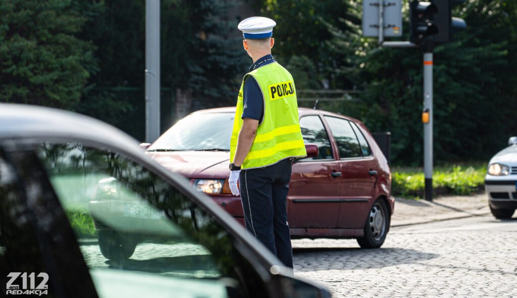 Funkcjonariusz przywołuje samochód na środek skrzyżowanie i wskazuje miejsce gdzie ma się zatrzymać.