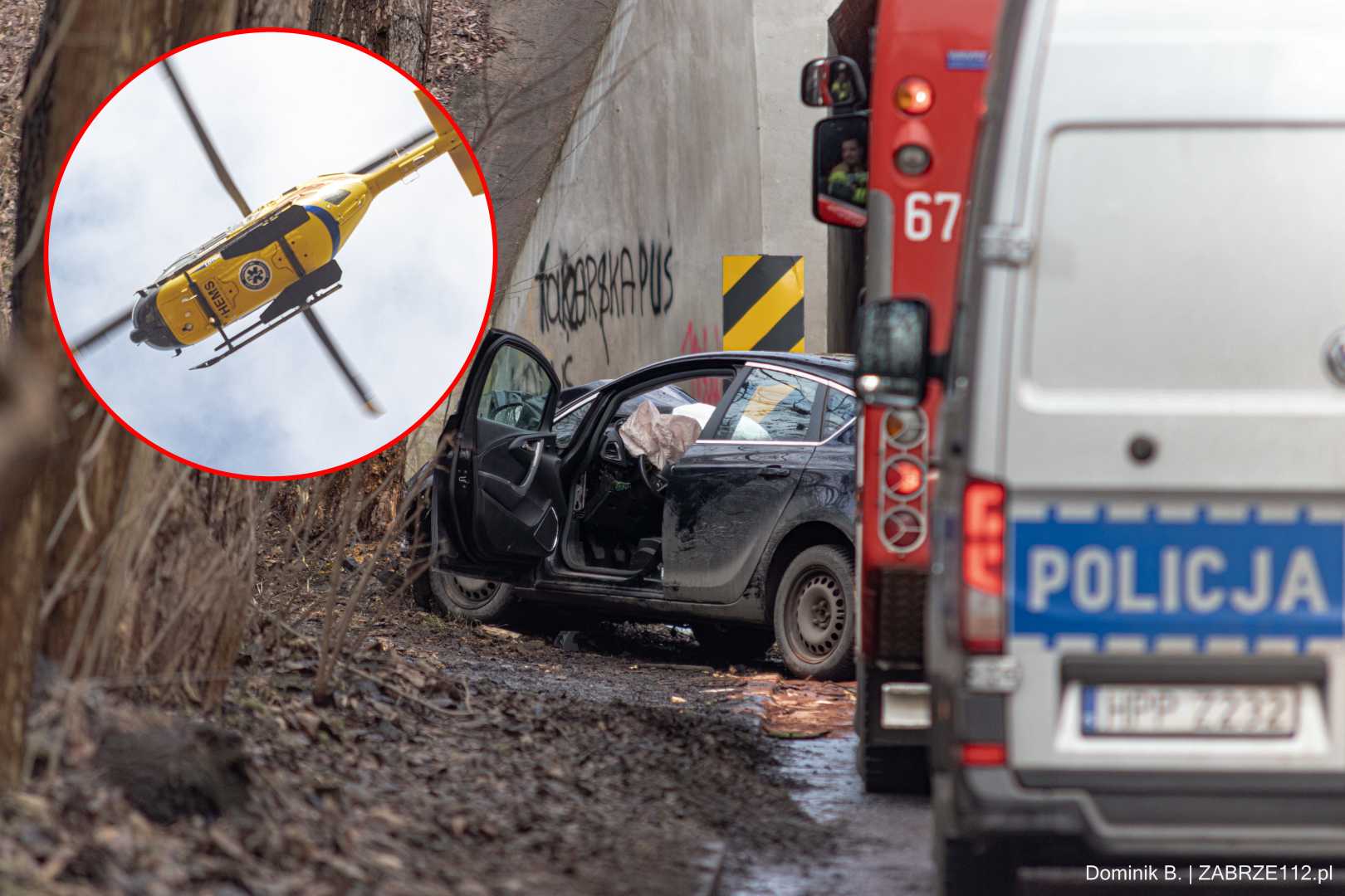 Koszmarny początek dnia na zabrzańskich drogach. Zaledwie chwilę po godzinie 10:00 służby ratunkowe odebrały zgłoszenie o bardzo poważnym wypadku drogowym na ulicy Drzymały. Samochód osobowy z potężną siłą wbił się w drzewo. Stan kierowcy wymagał pilnego wezwania Lotniczego Pogotowia Ratunkowego.
