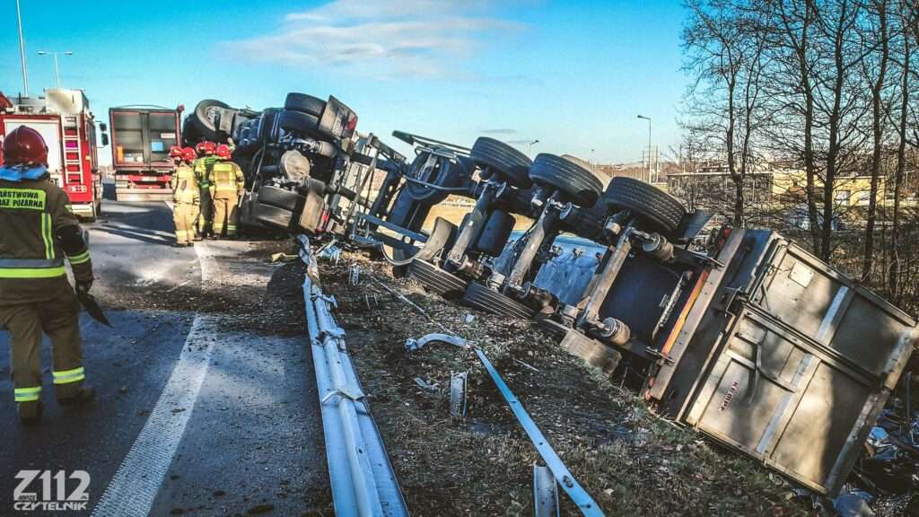 Po przybyciu na miejsce potwierdzono zgłoszenie, na łuku drogi miało dojść do wypadku samochodu ciężarowego który przewrócił się. Pojazd w swojej naczepie przewoził złom, kierujący pojazdem nie odniósł obrażeń. Zjazd w tym momencie jest zablokowany, działania strażaków polegają na zabezpieczeniu miejsca zdarzenia. Na miejscu pracuje również Policja, a dokładnie patrole z Komisariatu Autostradowego Policji. – dodaje starszy kapitan.