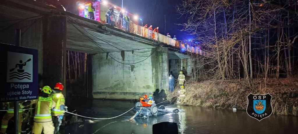 Potępa. Dzisiejszej nocy do rzeki Mała Panew z nieznanych jeszcze przyczyn wjechał samochód osobowy, w środku znajdowały się dwie osoby.
