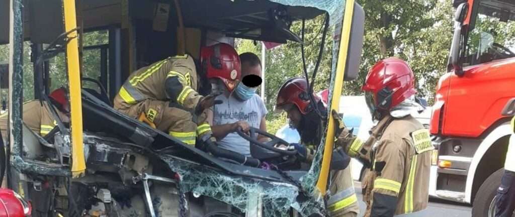 Po przybyciu na miejsce zdarzenia okazało się, że autobus linii miejskiej po zderzeniu z samochodem osobowym uderzył w słup trakcji sieci tramwajowej i znajduje się na torowisku. Samochód osobowy wskutek zderzenia również znalazł się na torach, a kierowca autobusu został uwięziony za kierownicą pojazdu.