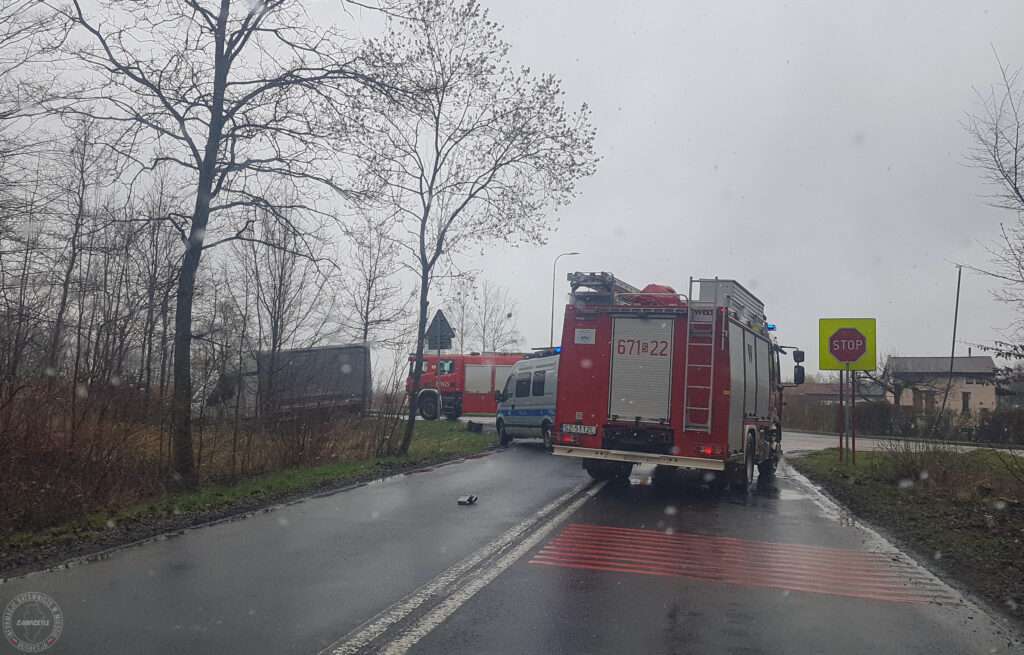 Kierowca oraz pasażer samochodu osobowego z urazami nóg zostali przetransportowani do szpitala przez Zespół Ratownictwa Medycznego.