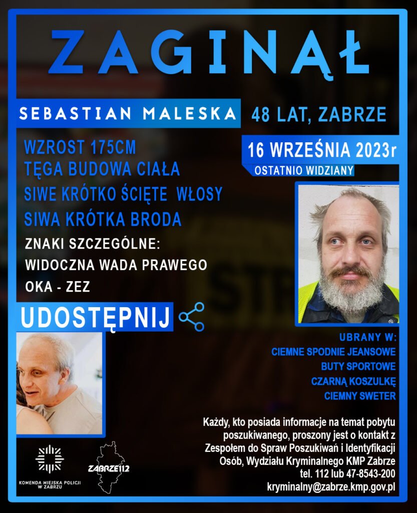 48-letni Sebastian Maleska zaginął 16 września 2023 roku. Mężczyzna wyszedł z domu i do chwili obecnej nie wrócił i nie nawiązał kontaktu z rodziną. W dniu zaginięcia 48-latek ubrany był w ciemne spodnie jeansowe, buty sportowe, czarną koszulkę i sweter koloru ciemnego. Zaginiony ma 175 centymetrów wzrostu, jest tęgiej budowy ciała. W trakcie policyjnych czynności odnaleziono samochód zaginionego na parkingu przy ulicy de Gaulle’a W Zabrzu obok ronda Sybiraków. Wszystkie osoby, które mają jakiekolwiek informacje na temat zaginionego i jego aktualnego miejsca pobytu proszone są o kontakt z Policją pod numerem telefonu 47 8543 200 lub numer alarmowy 112.
