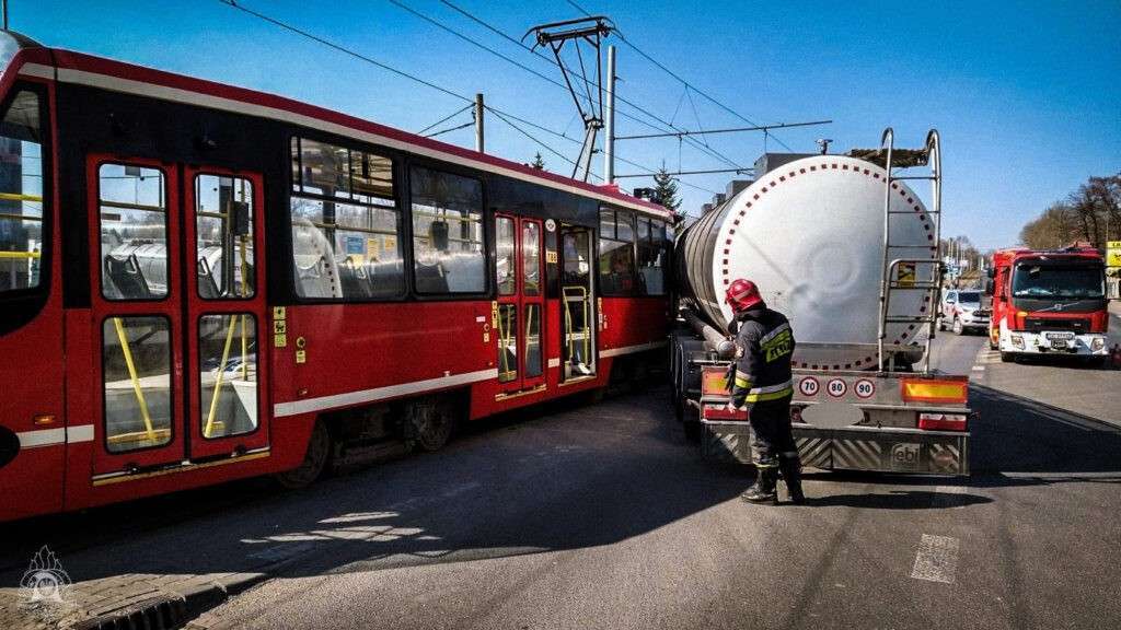 O godzinie 12:28 do Stanowiska Kierowania Komendanta Miejskiego Państwowej Straży Pożarnej w Bytomiu wpłynęło zgłoszenie o zderzeniu cysterny z tramwajem na ul. Łagiewnickiej. Na miejsce zadysponowano zastępy – czytamy na stronie KM